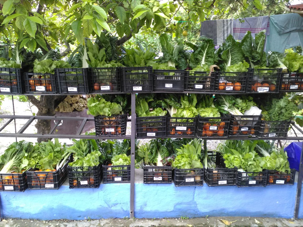 Elaboramos todas las semanas cestas cerradas, que contienen la variedad que existe en el momento en la huerta. Normalmente contiene 6 verduras y 1 ó 2 frutas dependiendo de la estación. Dentro de que es un formato cerrado, en el cual elegimos nosotrxs el contenido, se pueden realizar dos cambios por más cantidad de otro producto que ya contenga la cesta